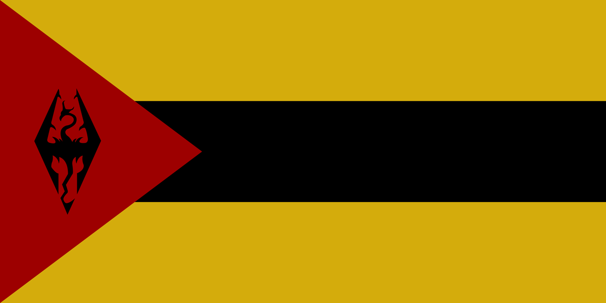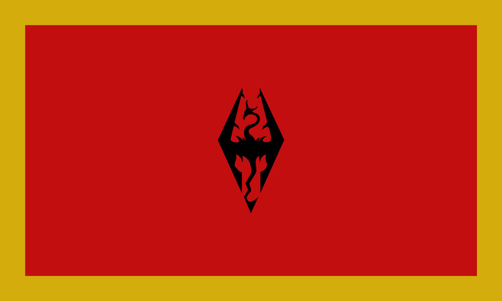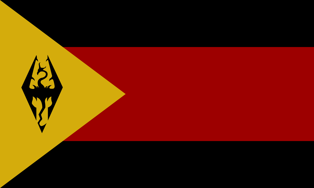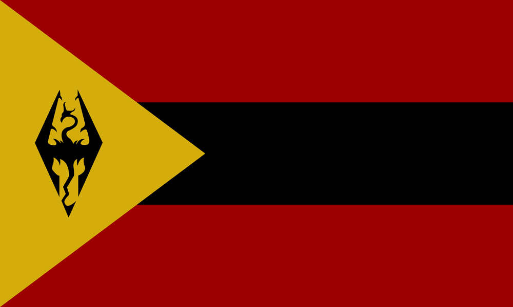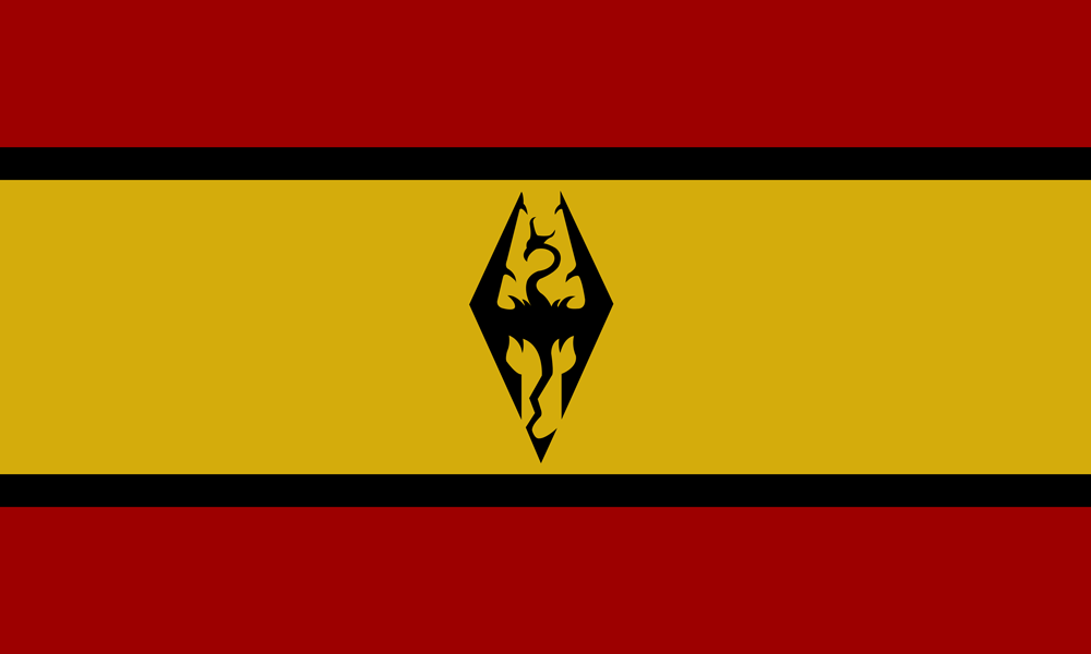A field Red; eleven twentieths field's width fess Black upon fly and hoist; nine twentieths field's width Gold upon fly and hoist; five twelfths field's width charge of Akatosh Black upon fly and hoist. Width of three feet; length of five feet.