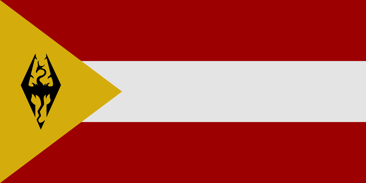 A field Red; one third field's width fess White upon fly; one third field's length chevron Gold upon fly; five twelfths field's width charge of Akatosh Black upon fly and hoist of chevron. Width of three feet; length of six feet.